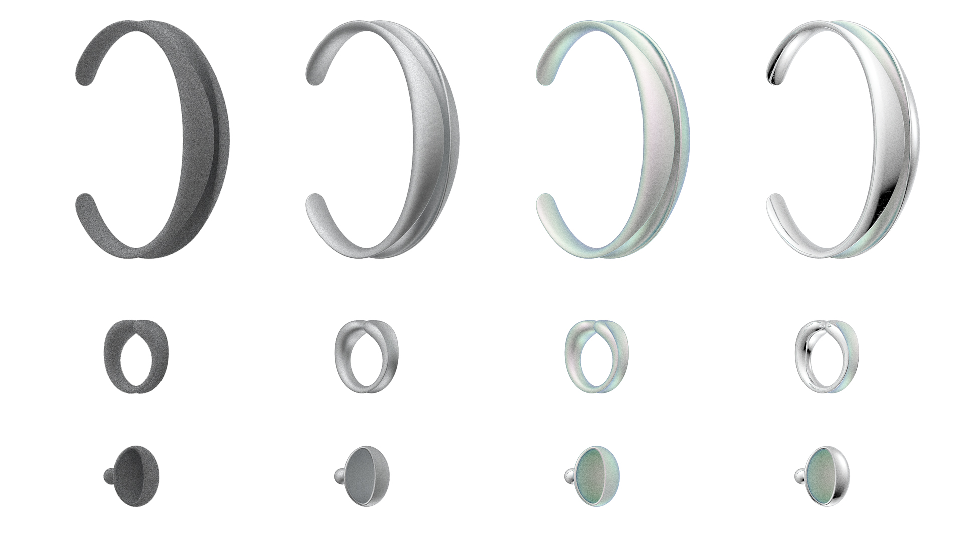 Raw 3D Printed Pieces in Metal ︎︎︎ First Treatment ︎︎︎ Coating ︎︎︎ Polishing